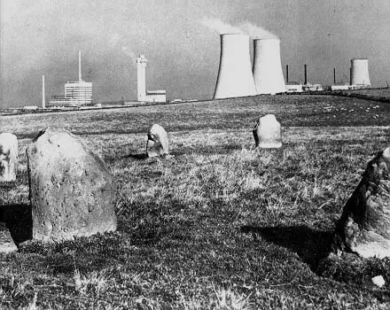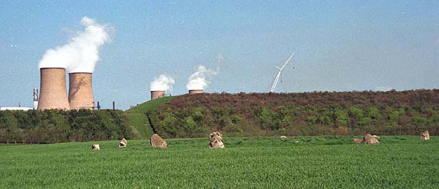 Few stone circles can have such an incongruous setting. A few hundred metres north of the circle is BNFL’s huge Sellafield Nuclear Site. Here is the world’s first commercial nuclear power station, Calder Hall, operating since the early 1950’s, and the Windscale Nuclear Reactor (Piles) – Britain’s first attempt at a nuclear reactor to produce plutonium for the war effort, which suffered a major incident in 1957. Here also is the Sellafield Reprocessing Plant – a controversial site that converts the spent fuel from nuclear reactors worldwide into re-useable uranium, plutonium, and highly radioactive fission products that will have to be safely stored for thousands of years.